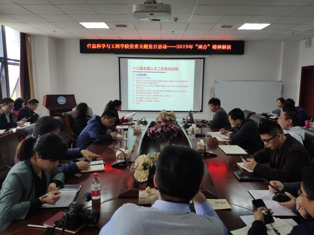 为更好推动全国“两会”精神在我校师生中落地生根,4月30日,我校信息科学与工程学院党委举行了主题党日活动,特邀大学副校长彭清华作2019年全国“两会”精神解读专题讲座,学院党委的72名师生党员参加了活动。